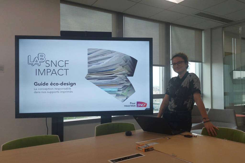 Durant mon stage au sein du Lab SNCF Impact, j’ai eu l’occasion de travailler sur l’écodesign. Sous la direction RSE de la SNCF on évoque beaucoup de sujets, celui qui me tient à cœur est celui du print car j’ai toujours aimé manipuler des supports imprimés (livres, dépliants…).